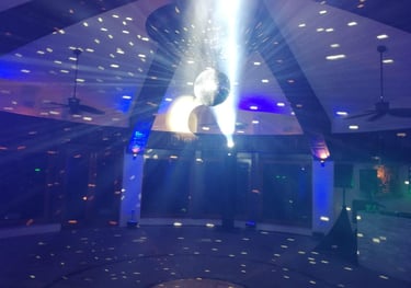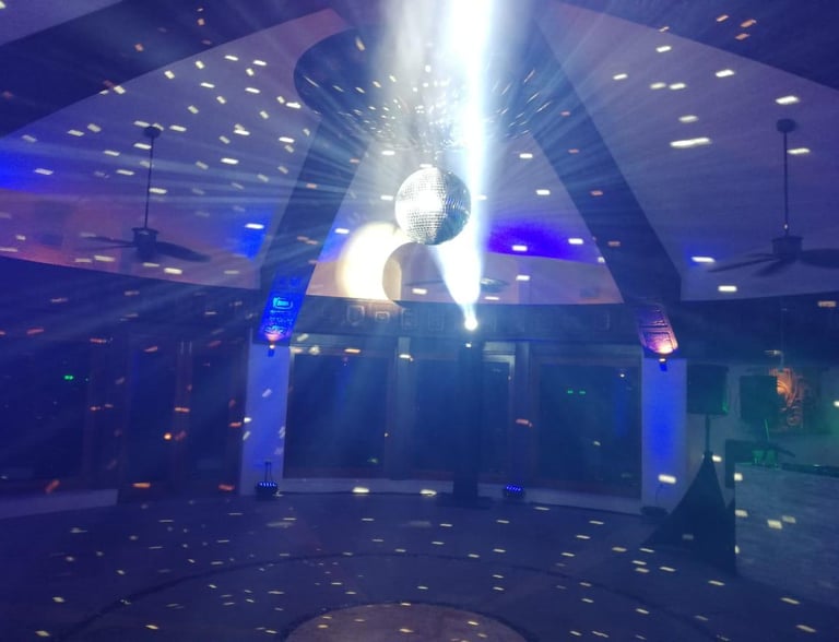 Esfera espejada que refleja la luz en múltiples direcciones, creando un efecto retro y festivo en la pista de baile.
