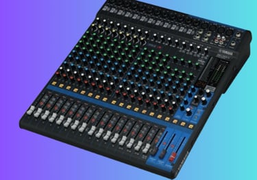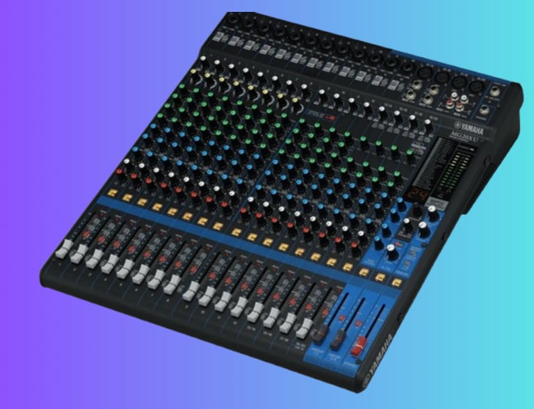 Consola grande de 20 canales, diseñada para manejar múltiples micrófonos e instrumentos al mismo tiempo. Ofrece calidad de sonido profesional para conciertos o eventos grandes.