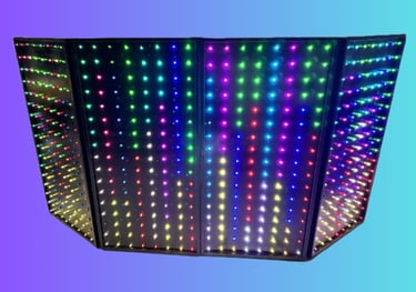 Cabina iluminada con paneles LED pixelados que generan patrones y efectos visuales sincronizados con la música.