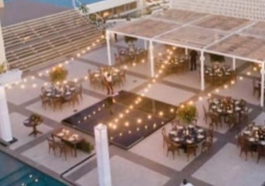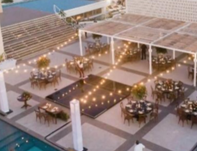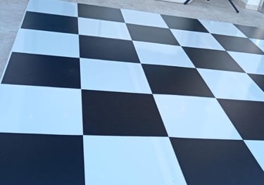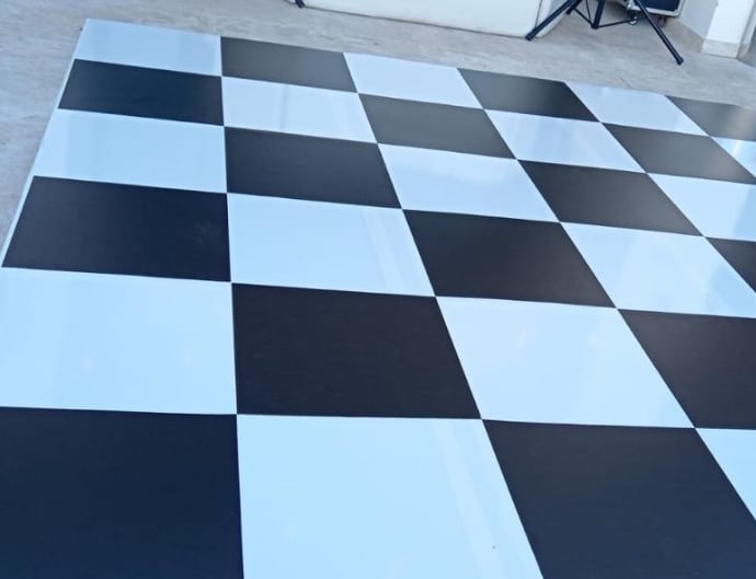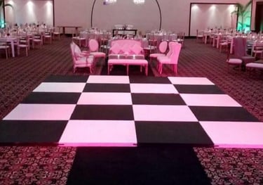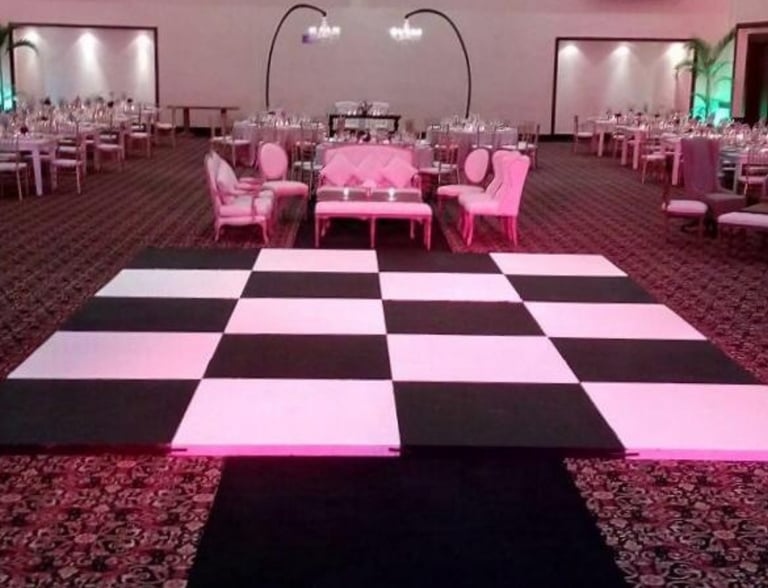Pista tipo ajedrez en colores blanco y negro, que aporta un estilo clásico y elegante. Perfecta para eventos formales y recepciones de boda.