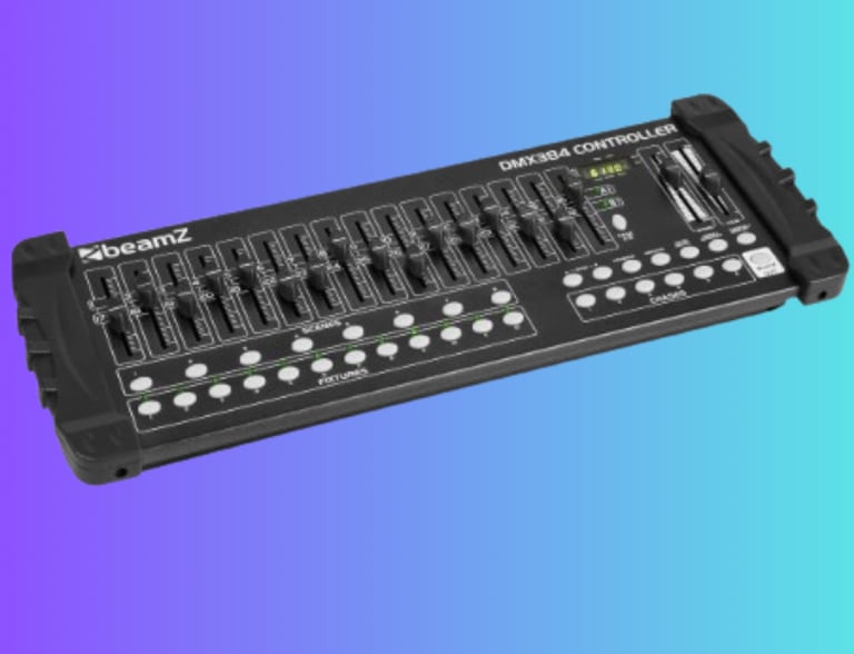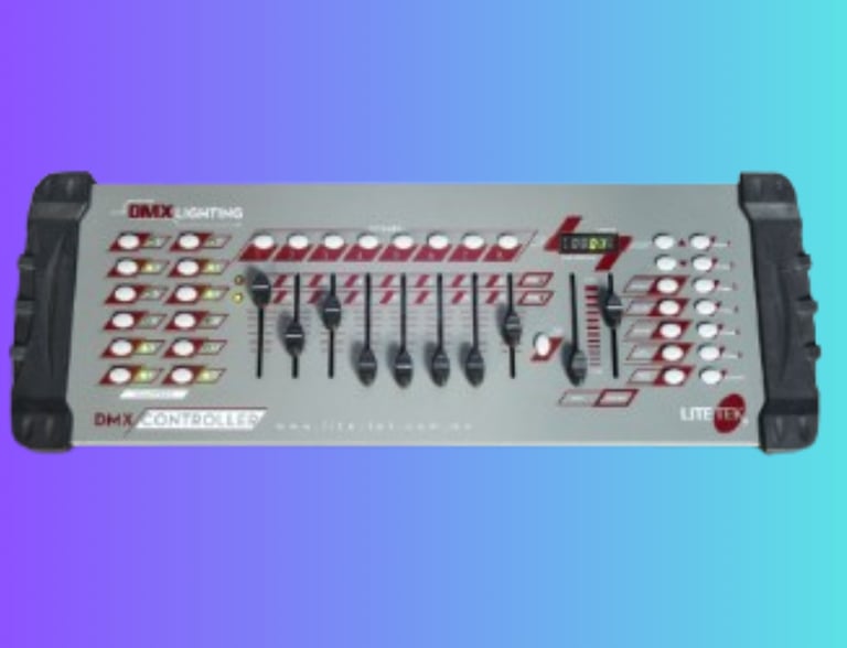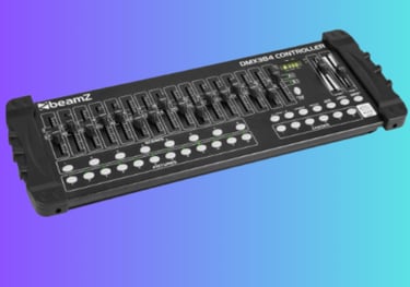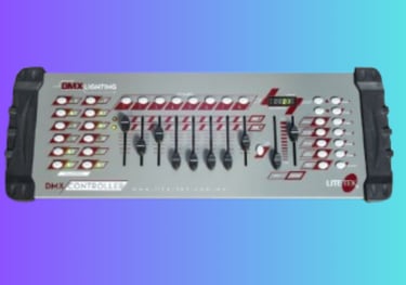 Controlador sencillo para luces DMX, permite manejar hasta 192 canales. Perfecto para controlar iluminación en eventos pequeños o medianos.