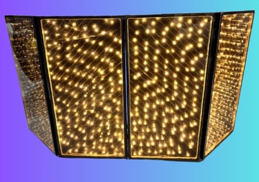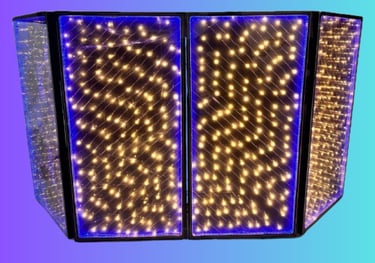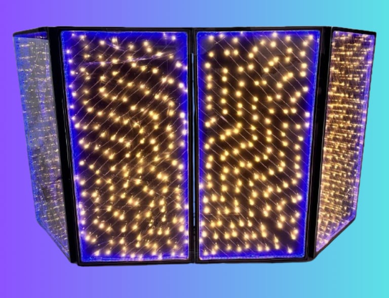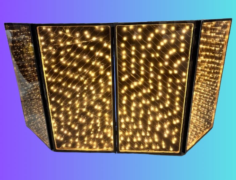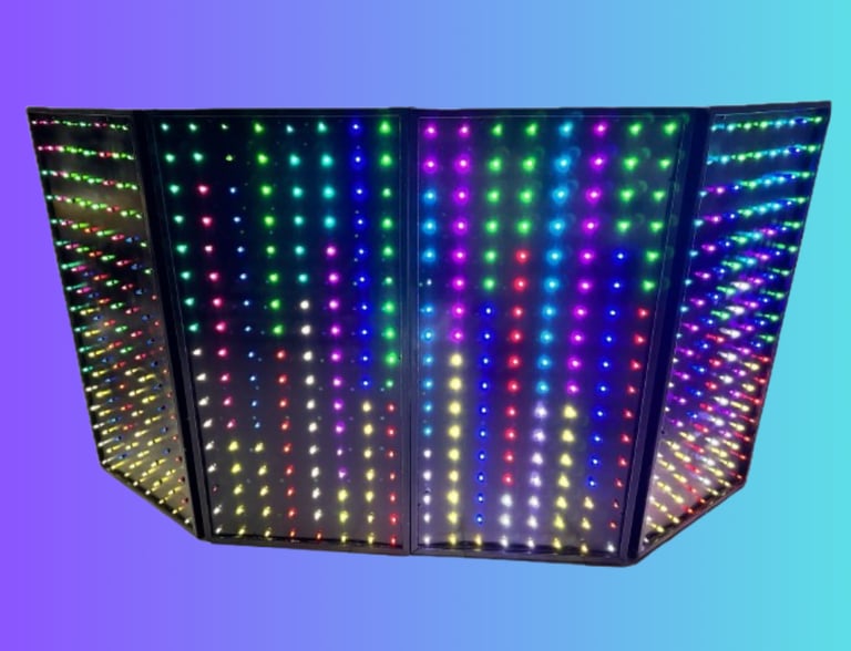Pista con paneles de acrílico negro y luces LED que crean un efecto visual de profundidad infinita. Ideal para dar un toque moderno y elegante a cualquier fiesta.