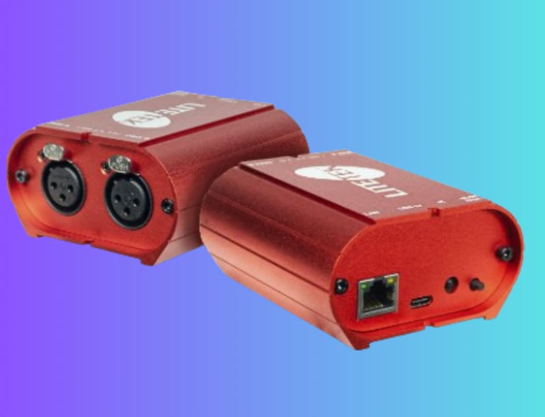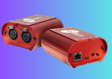 Interfaz profesional que conecta las luces DMX a la computadora para programar y controlar la iluminación con software especializado.