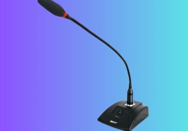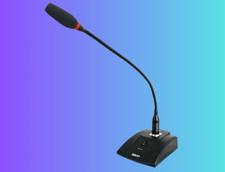 Micrófono de cuello de ganso diseñado para podios o mesas de conferencias. No es de mano ni para instrumentos; su propósito es permitir que el presentador hable cómodamente sin necesidad de sostener un micrófono.
