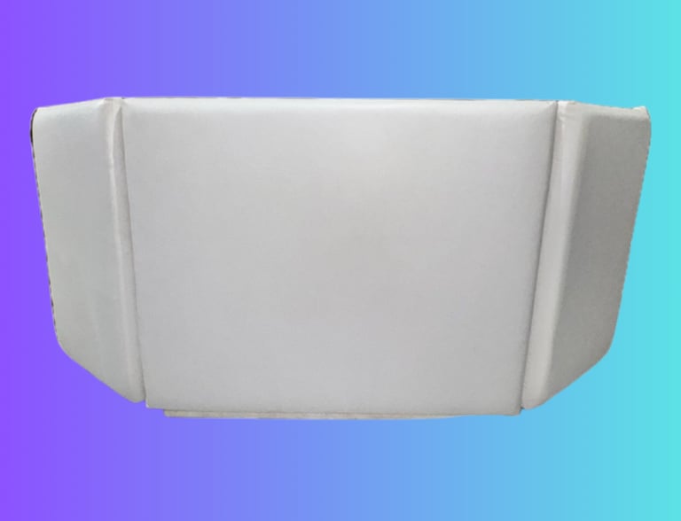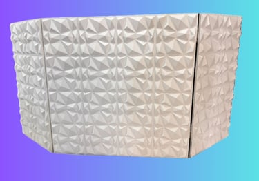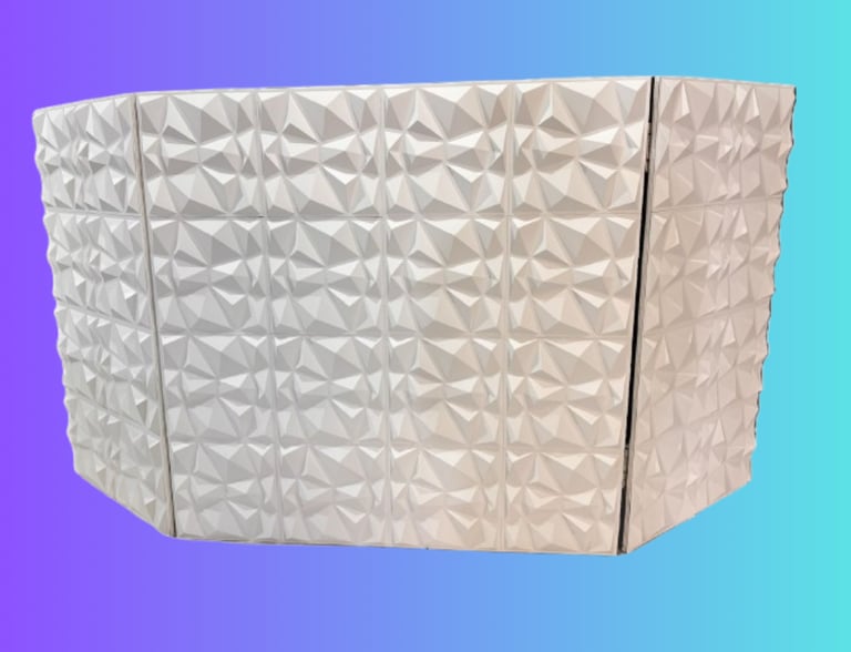 Cabina de DJ con paneles blancos en relieve 3D, que aportan textura y un efecto visual llamativo con iluminación.