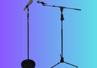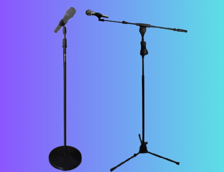 Soportes ajustables para micrófono. El pedestal normal es recto, ideal para discursos o canto de pie, mientras que el de boom incluye brazo articulado para mayor comodidad en instrumentos o vocalistas.