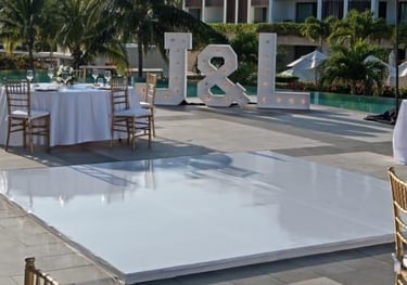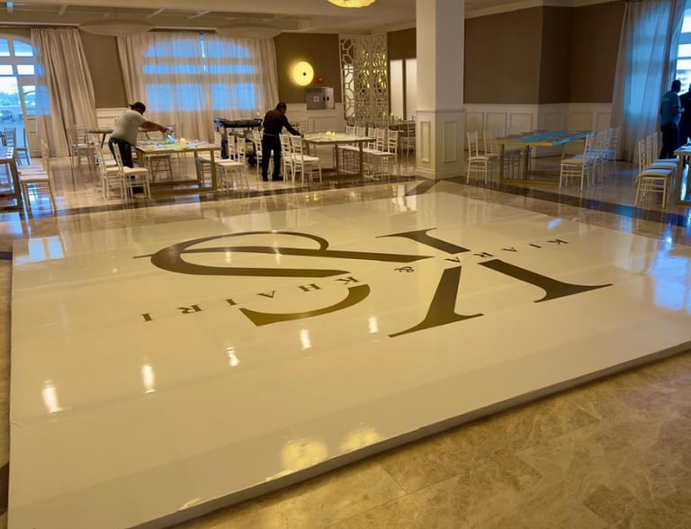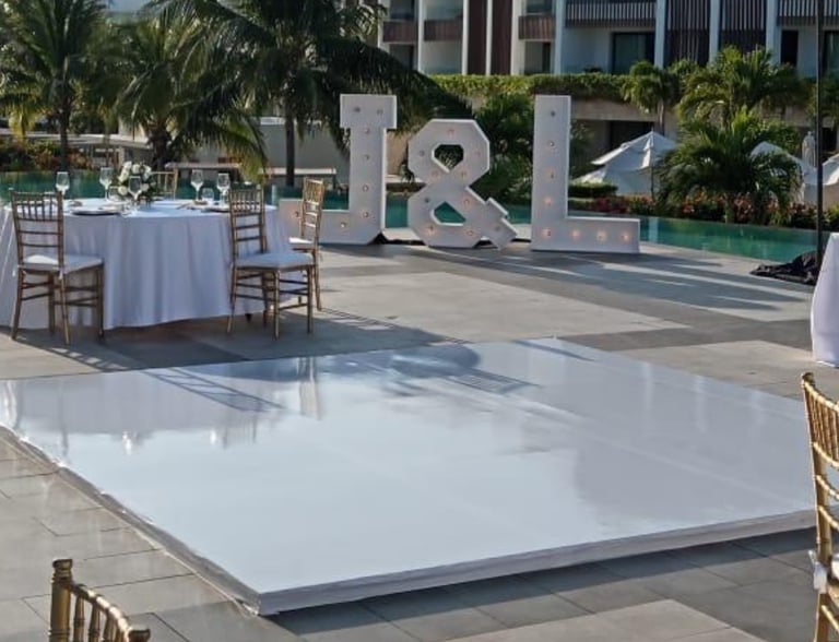 Pista personalizada con iniciales, logotipo o diseños proyectados en la superficie. Aporta un detalle único y elegante al evento.