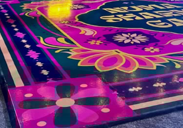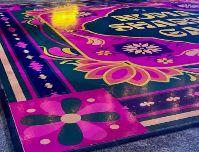 Pista recubierta con vinil impreso a la medida. Puede llevar nombres, logotipos o diseños personalizados para que cada evento tenga un toque exclusivo.