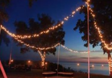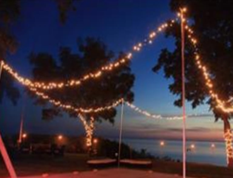 Luces instaladas en patrón de zigzag, de un extremo a otro del área, creando un techo luminoso sencillo y acogedor. Ideal para terrazas o jardines.