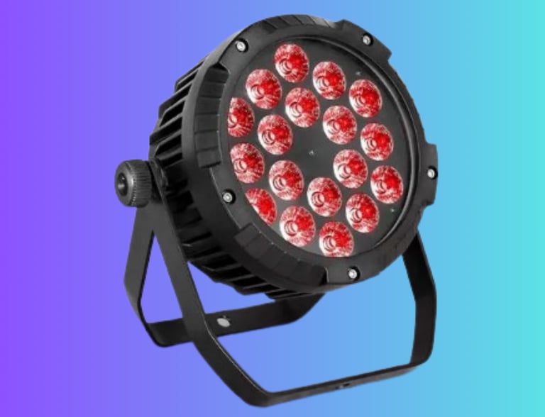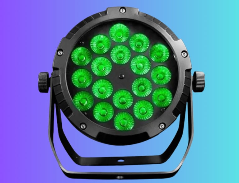 Foco LED profesional con 18 LEDs de 15W cada uno. Permite crear colores intensos y mezclas para ambientar escenarios, salones y pistas de baile. Puede colocarse en el suelo, colgado o en estructuras.