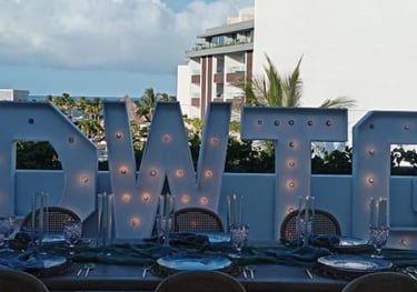 Iniciales, palabras o frases temáticas que complementan el montaje y personalizan el evento.