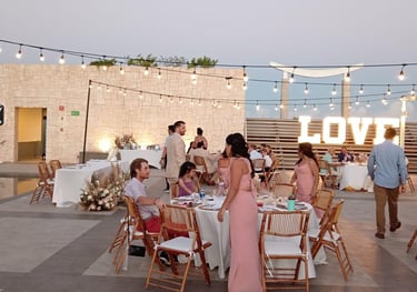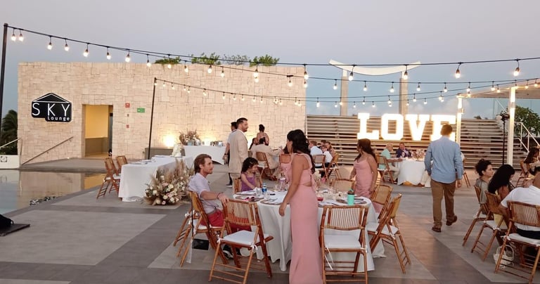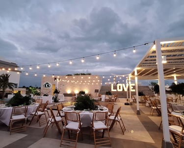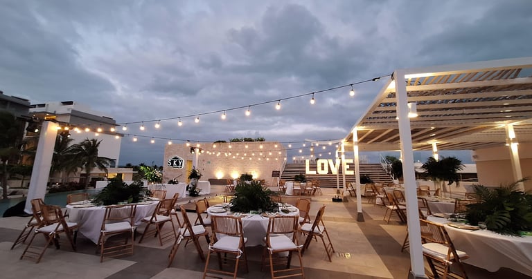 Luces colgantes y letras iluminadas “LOVE” como punto focal.